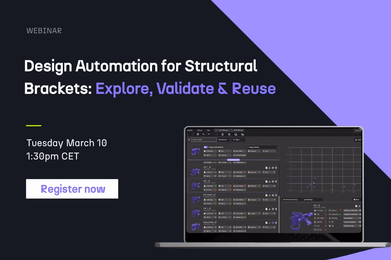 In this webinar, we address a recurring bottleneck faced by engineering teams in Aerospace, Automotive, Defense, and other industrial manufacturing that design hundreds of structural brackets per year: engineers spend most of their time on manual model generation, leaving little room to explore designs and push performance boundaries. When a geometry changes, the process starts over from scratch.